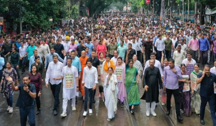 अपनी बंगाली पहचान का राग अलापते हुए पश्चिम बंगाल की मुख्यमंत्री ममता बनर्जी ने बारिश में भीगते हुए भाजपा शासित राज्यों में बंगाली भाषी लोगों के कथित उत्पीड़न के खिलाफ कोलकाता में एक विशाल विरोध मार्च निकाला। कोलकाता के मध्य में आयोजित यह विरोध मार्च एकता का भी प्रदर्शन था क्योंकि इसमें अभिषेक बनर्जी सहित सत्तारूढ़ तृणमूल कांग्रेस के सभी शीर्ष नेता शामिल हुए। लगातार बारिश के बीच तृणमूल सुप्रीमो और अन्य नेताओं के तीन किलोमीटर लंबे रास्ते पर बीजेपी, छी छी (शर्म करो बीजेपी) के नारे गूंज रहे थे। लगभग 1,500 पुलिसकर्मी पूरे रास्ते पर पहरा दे रहे थे। रैली के बाद, ममता ने जनसभा को संबोधित करते हुए केंद्र को चुनौती दी कि वह उन्हें डिटेंशन कैंप में डाल दे।