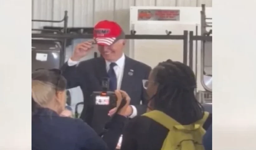 JUST IN: Joe Biden puts on a Trump hat during an event in Shanksville, Pennsylvania.