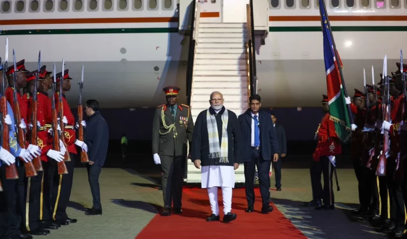 प्रधानमंत्री नरेन्द्र मोदी पांच देशों की अपनी यात्रा के अंतिम चरण में बुधवार को नामीबिया पहुंचे जहां वह नामीबियाई राष्ट्रपति नेटुम्बो नंदी-नदैतवा के साथ द्विपक्षीय वार्ता करेंगे। यह प्रधानमंत्री मोदी की नामीबिया की पहली और भारत से किसी प्रधानमंत्री की तीसरी यात्रा है।आगमन पर प्रधानमंत्री का औपचारिक स्वागत किया गया और उन्होंने पारंपरिक नामीबियाई ढोल बजाने का अभ्यास किया। मोदी राष्ट्रपति नंदी-नदैतवा के निमंत्रण पर नामीबिया की यात्रा कर रहे हैं। प्रधानमंत्री मोदी अपनी यात्रा के दौरान राष्ट्रपति नंदी-नदैतवा के साथ द्विपक्षीय वार्ता करेंगे। प्रधानमंत्री नामीबिया के संस्थापक जनक एवं प्रथम राष्ट्रपति दिवंगत डॉ. सैम नुजोमा को भी श्रद्धांजलि देंगे। उनके नामीबिया की संसद को संबोधित करने की भी उम्मीद है।