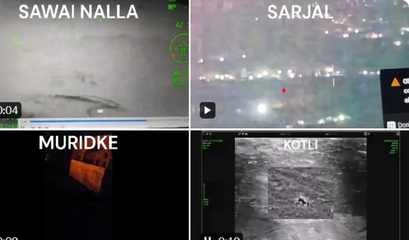भारतीय सेना ने बुधवार की सुबह ‘ऑपरेशन सिंदूर’ के तहत पाकिस्तान और पाक अधिकृत कश्मीर में आतंकी मुख्यालयों पर किए गए सटीक मिसाइल हमलों की वीडियो क्लिप जारी की है। सवाई नल्ला, सरजाल, मुरीदके, कोटली, कोटली गुलपुर, महमूना जोया, भीमबेर और बहावलपुर समेत पाकिस्तान के नौ ठिकानों पर हमला किया गया। भारत के रक्षा मंत्रालय ने कहा कि ‘सिंदूर’ नामक ऑपरेशन में भारतीय सशस्त्र बलों ने बुधवार तड़के पाकिस्तान और पाकिस्तान के कब्जे वाले कश्मीर (पीओके) में आतंकवादी बुनियादी ढांचे पर हमले किए, जबकि पाकिस्तान ने कहा कि वह अपनी पसंद के समय और स्थान पर जवाब देगा।
