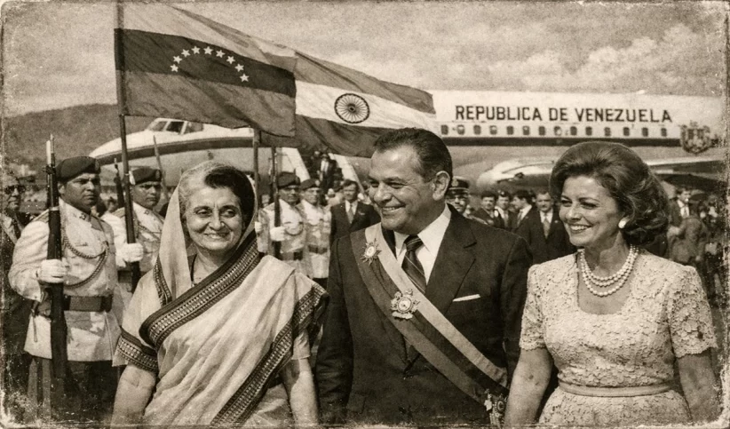 10 अक्टूबर, 1968 को दोपहर के 12:45 बज रहे थे। प्रधानमंत्री इंदिरा गांधी को लेकर एक विशेष विमान विमान वेनेजुएला के साइमन बोलिवर अंतरराष्ट्रीय हवाई अड्डे पर लैंड करता है। वातावरण उत्साह से भरा हुआ था, क्योंकि यह पहली बार था जब कोई भारतीय प्रधानमंत्री इस लैटिन अमेरिकी देश का दौरा कर रही थीं। गांधी का स्वागत वेनेजुएला के राष्ट्रपति राउल लियोनी और उनके मंत्रिमंडल के मंत्रियों ने किया। विमान से उतरते ही, सैन्य बैंड ने पहले भारतीय राष्ट्रगान बजाया, उसके बाद वेनेजुएला का राष्ट्रगान बजाया गया। गांधी जी की वेनेजुएला यात्रा उनके लंबे लैटिन अमेरिकी और कैरेबियन दौरे का हिस्सा थी, जो 23 सितंबर को कोलंबिया से शुरू हुआ था। उनके यात्रा कार्यक्रम में ब्राजील, चिली, उरुग्वे और अर्जेंटीना भी शामिल थे। हालांकि उन्होंने वेनेजुएला में केवल 18 घंटे बिताए, लेकिन यह यात्रा देश के राजनेताओं और नागरिकों के साथ सौहार्दपूर्ण मुलाकातों से भरी रही। भारत लौटने पर गांधी जी ने लोकसभा में कहा कि अपने दौरे के दौरान उन्हें एहसास हुआ कि “हम दक्षिण अमेरिका के बारे में उतना नहीं जानते जितना दक्षिण अमेरिका हमारे बारे में जानता है। उन्होंने कहा कि महात्मा गांधी, रवींद्रनाथ टैगोर और जवाहरलाल नेहरू के नाम उन सभी देशों में व्यापक रूप से जाने जाते हैं और उद्धृत किए जाते हैं, जहां उन्होंने दौरा किया।